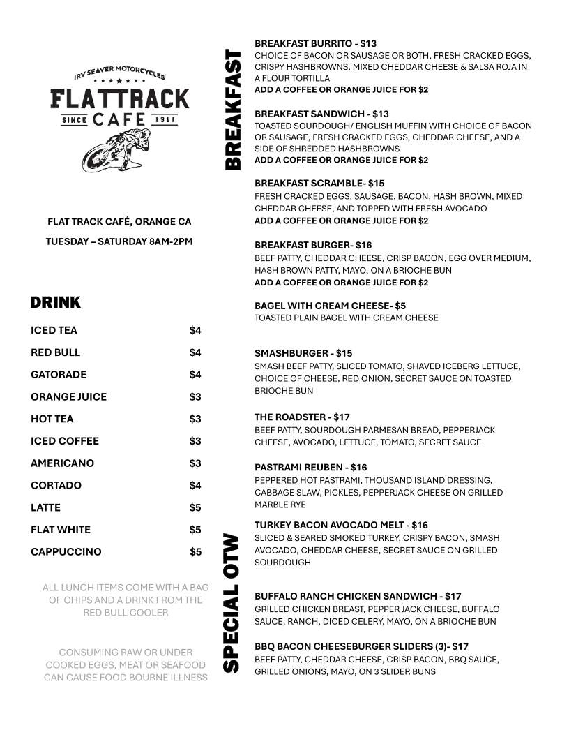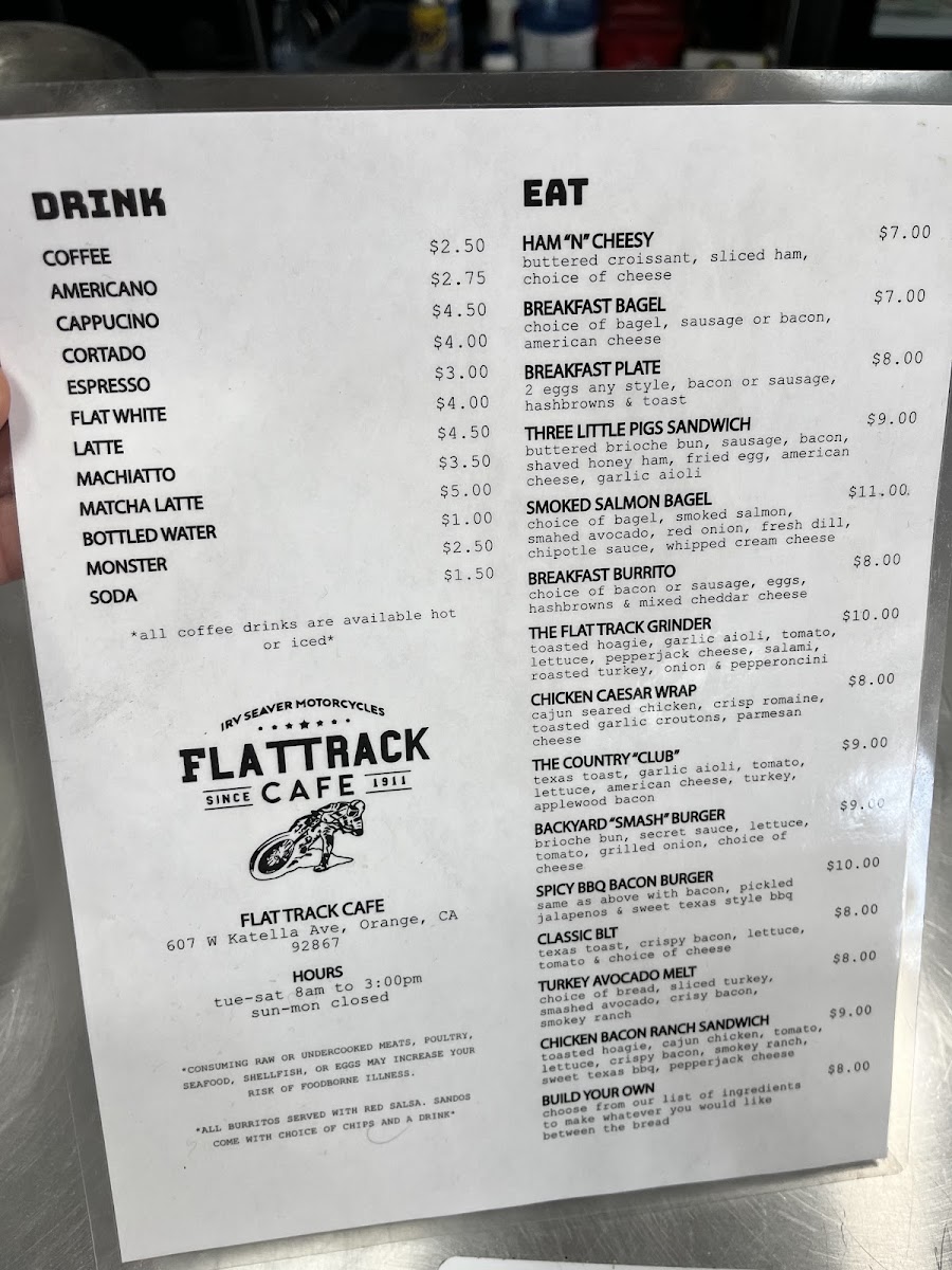 Welcome to Flattrack Café, an inviting gem located at 535 W Katella Ave in Orange, CA. This café is not just a place to grab a quick bite; it's an immersive experience for food lovers and motorcycle enthusiasts alike. Imagine the aroma of freshly cooked breakfast wafting through the air as you step into a space that celebrates the thrill of the ride, complete with stunning motorcycles from decades past, adding an extra layer of charm to your dining experience.